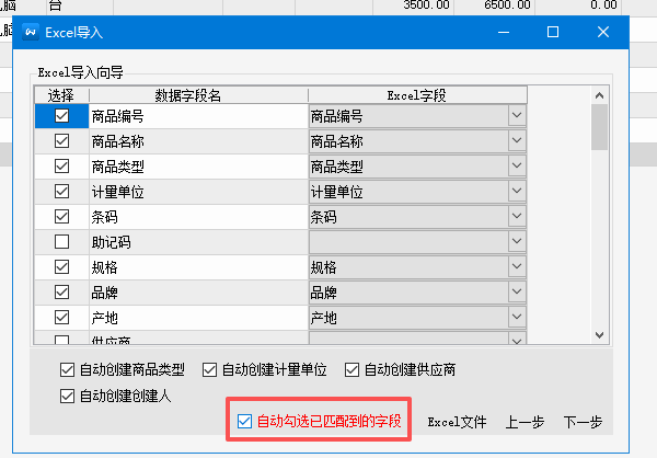 2.导入时可以打勾自动勾选已匹配到的字段,将自动识别excel里的列名,不再手动打勾