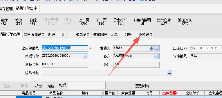 6.设置销售出库收款时,上方顶部栏可显示收款记录