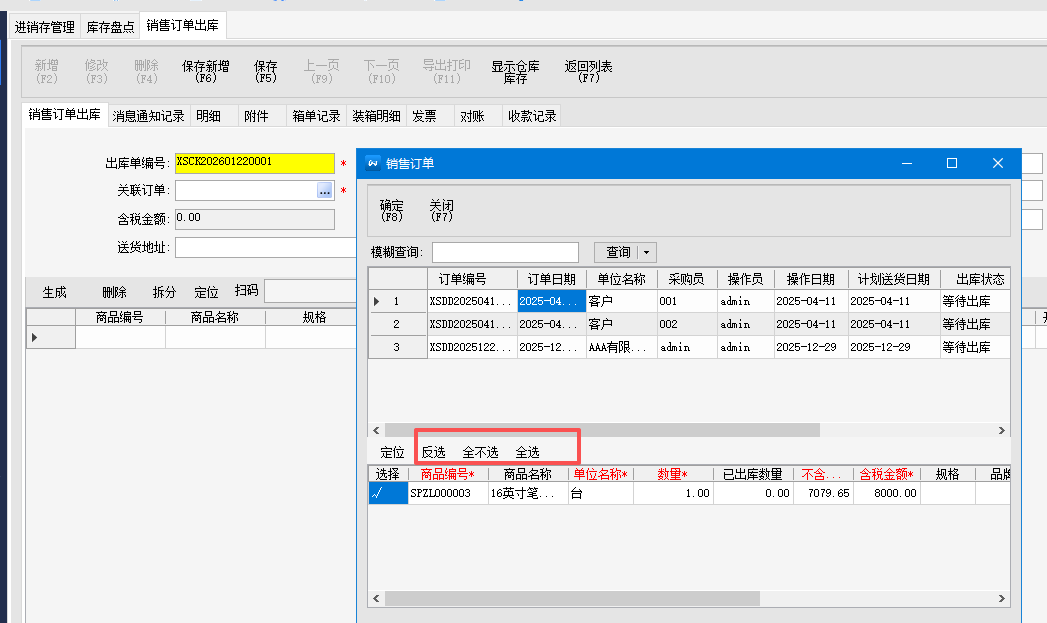 8.销售出库引用订单时,增加全选/反选商品