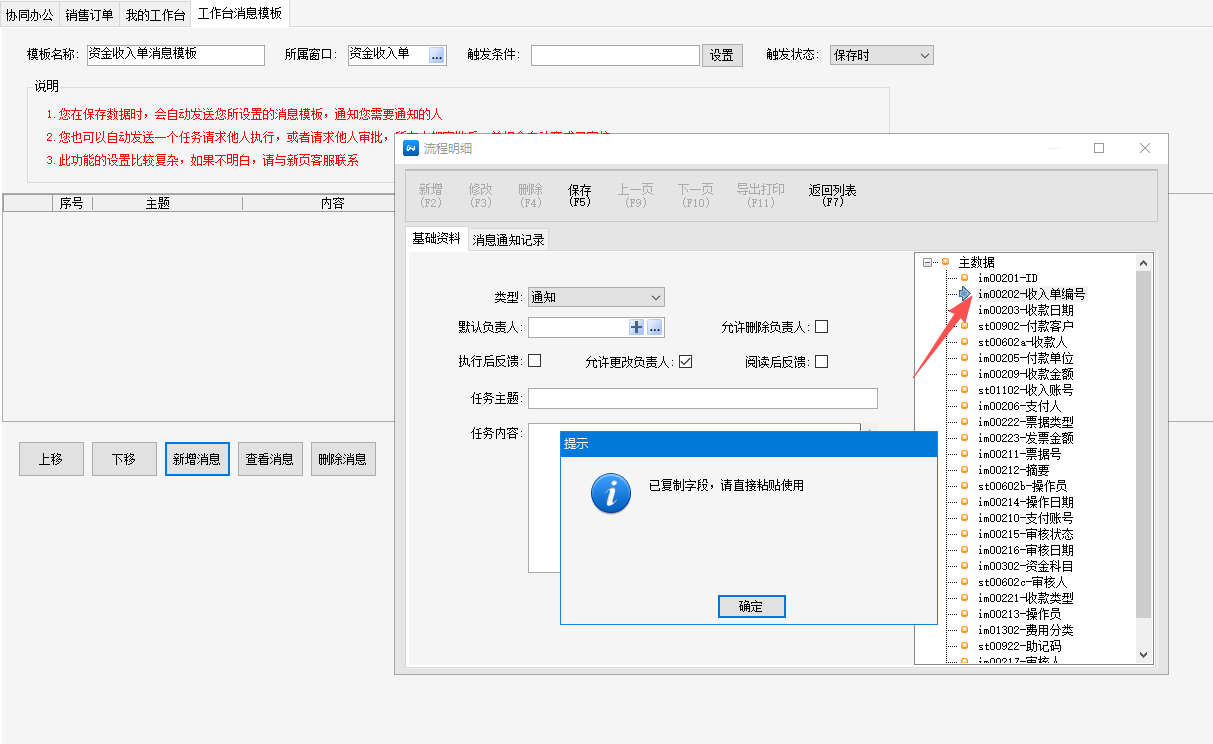 2.工作台消息模板,双击右侧字段可以复制使用